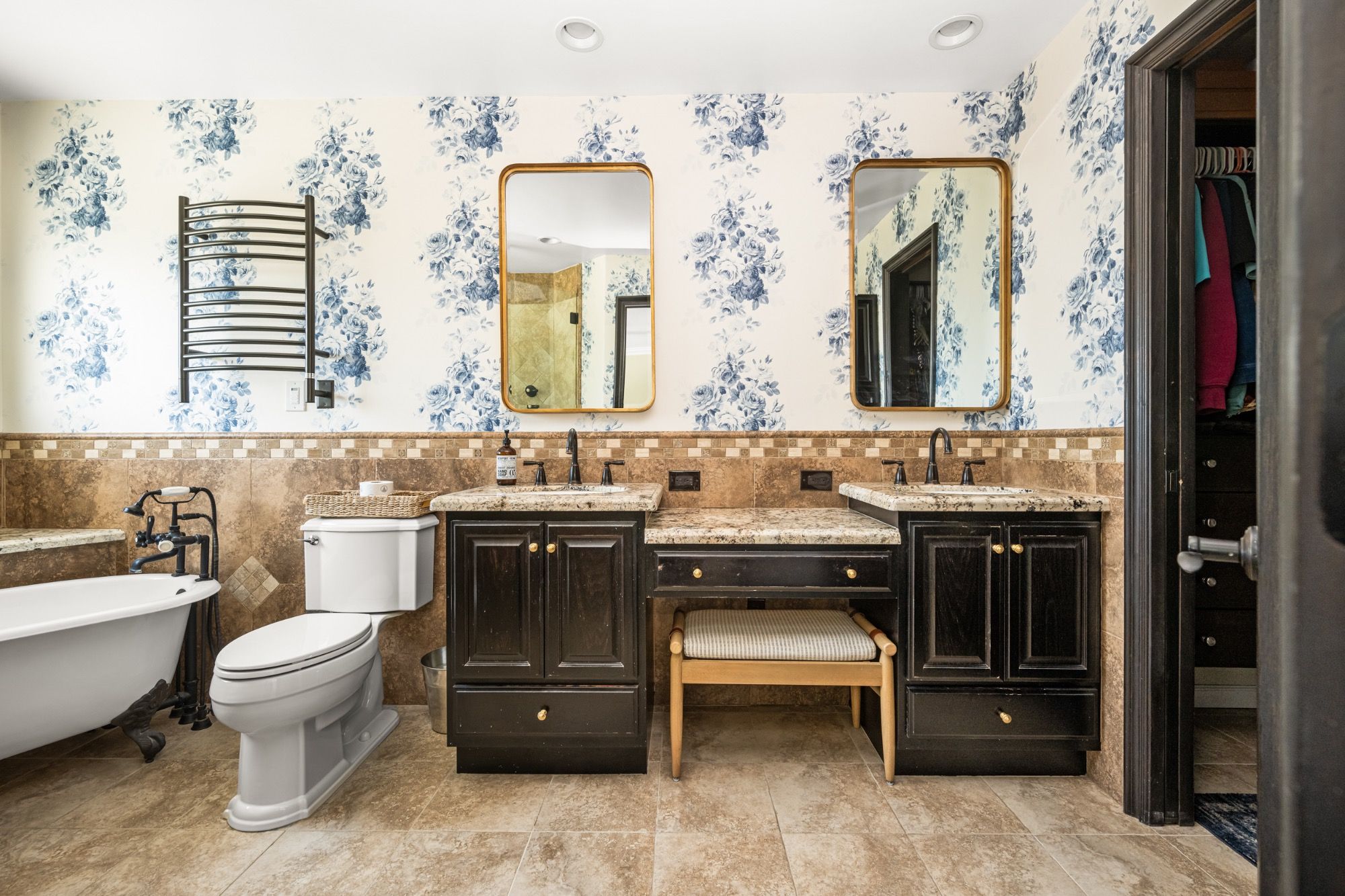 Upstairs, the primary suite is an oasis of comfort and luxury. It features crown molding, a ceiling fan, and custom built-ins. The spa-like en-suite is a retreat in itself, offering a walk-in shower with rain fixtures, a luxurious claw-footed soaking tub, a custom walk-in closet, and a heated towel warmer. Two additional spacious bedrooms share an updated full bathroom with a shower over the tub, providing ample space for family or guests.